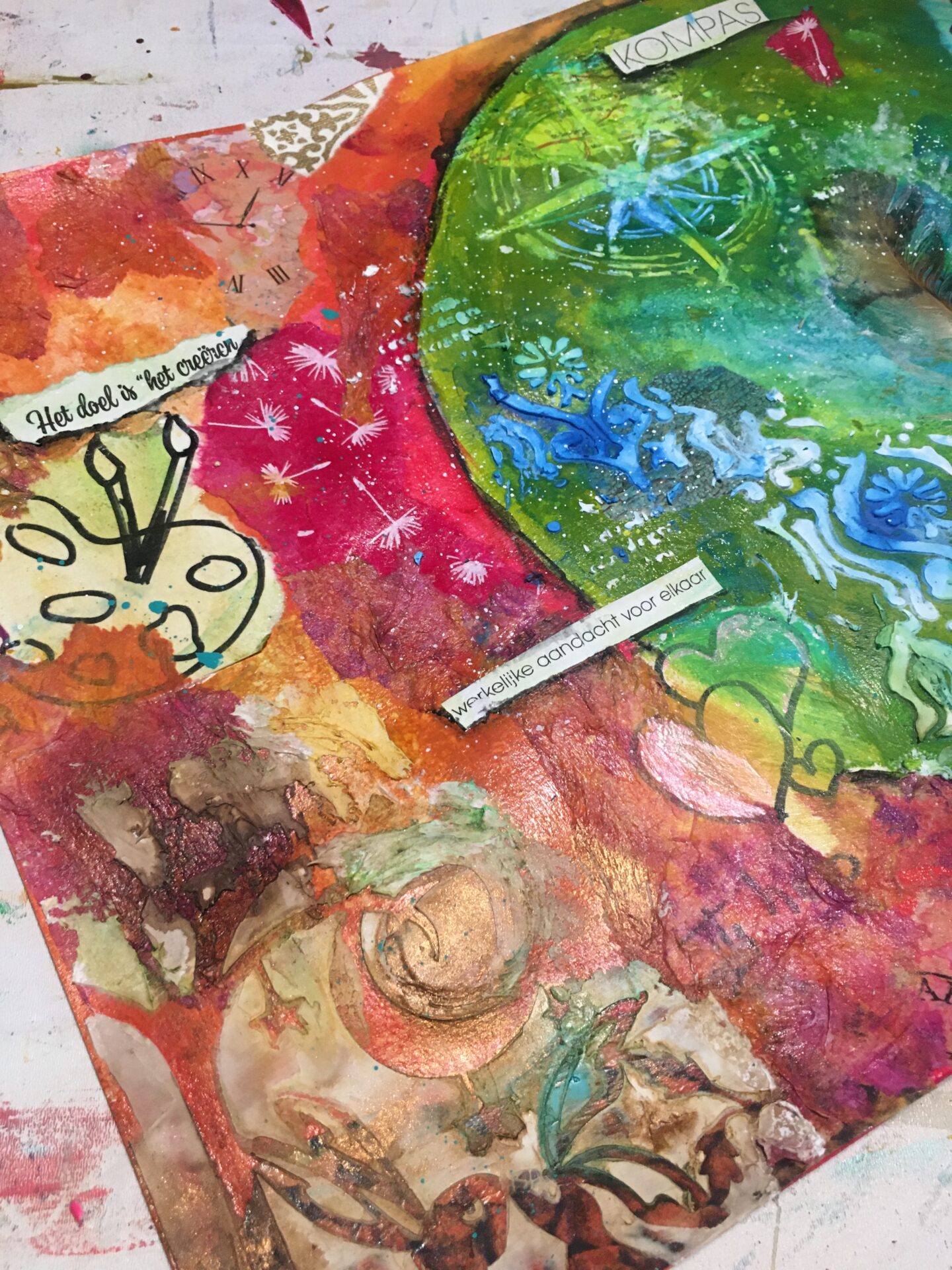 On May 6, we will fill an A3 page with your sources of inspiration, and we will explore these in advance by drawing an oracle card, discovering your ‘inspiration form method,’ and we will build the page layer by layer. The base layer will be your inspiration color, but on top of this we will work with paper, stencils, and stamps. And you choose your inspirational images for this. I will share a lot about color psychology and the language of symbolism, so that after this workshop you also have tools to use your sources of inspiration daily.
