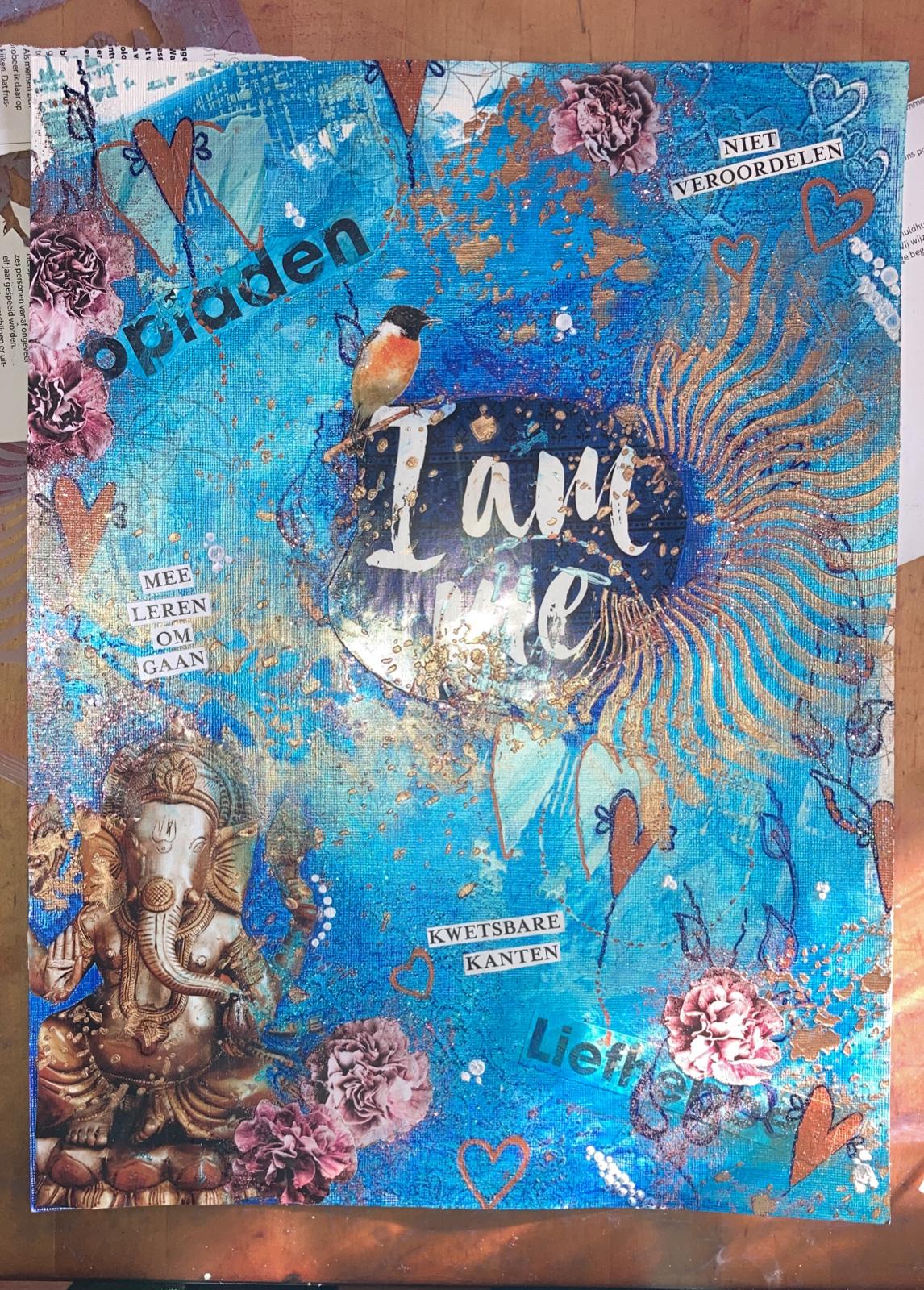 Op 6 mei gaan we een A3 pagina vullen met jouw Inspiratiebronnen, en deze gaan we vooraf onderzoeken d.m.v. een orakelkaart trekken, jouw ‘inspiratievorm-methode’ te ontdekken en we bouwen laag voor laag de pagina op. De onderlaag wordt jouw inspiratie kleur maar daarop werken we met papier, sjablonen, stencils en stempels. En jij kiest jouw inspiratie afbeeldingen hierbij. Ik zal hierbij veel delen over kleurenpsychologie en symboliektaal, zodat je na deze workshop ook handvaten hebt om jouw inspiratiebronnen dagelijks in te zetten.